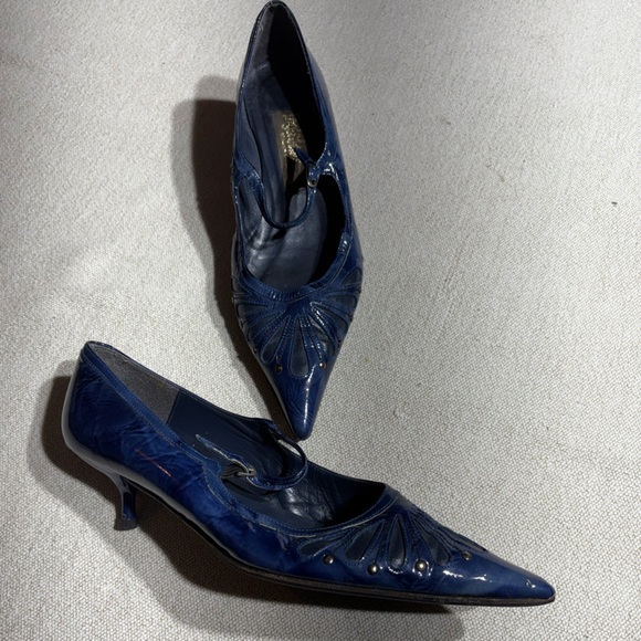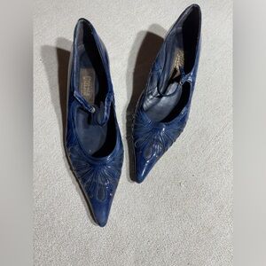 Ingledew’s Vintage Patent Leather Blue Pointed Toe Kitten Heel Spanish Heels