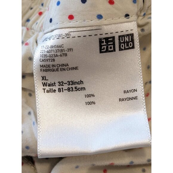 The Inés de la Fressange x Uniqlo Dot Print Easy Pants in White Blue Red Dots are a stylish and comfortable option for women in size XL. These pull-on pants feature a relaxed fit with a high-rise waist and a bootcut leg style, perfect for a casual travel or leisure outfit. Made from rayon material, these pants have a stretch waist and pockets for added convenience. The multicolor polka dot pattern adds a fun and bohemian touch to the chino-style design, making them a versatile choice for the warmer seasons of summer, fall, and spring.