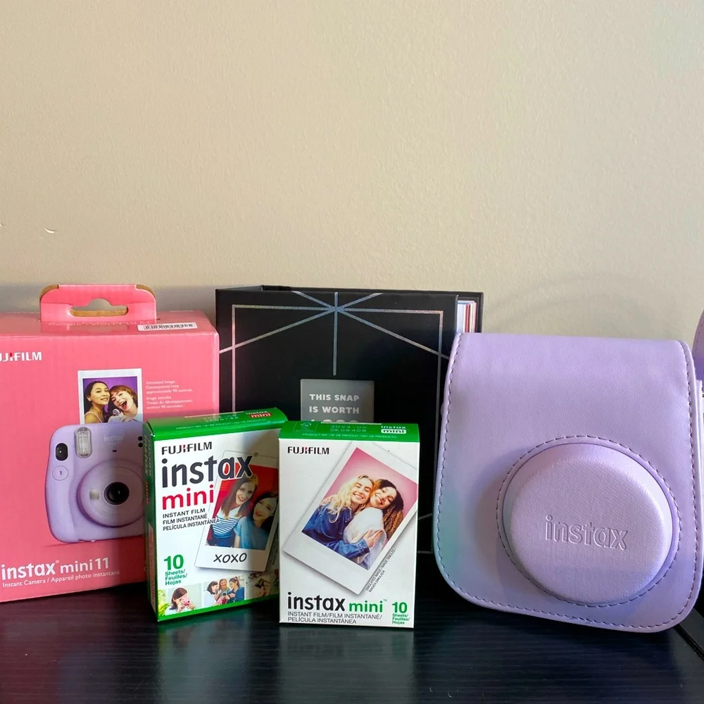 Includes Instax Mini 11 Camera (lilac purple), branded case, photo book, and 2 packets of film. Camera has been opened but never used.