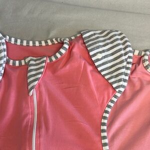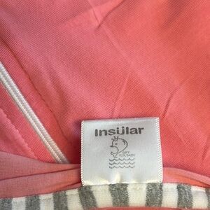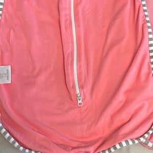 Charming pink baby sleep sacks by Insular. Features adorable striped sleeves.