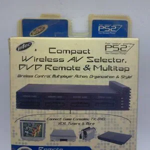 For the PS2 game system, this is an unopened "Compact AV Selector, DVD Remote & Multiap." Its plastic case has a few tears and is 9" by 6" by 2" deep and it was made by Intec.