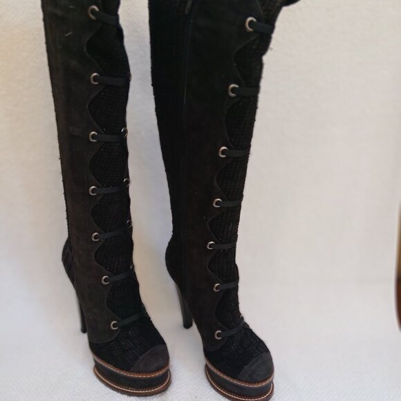These are an interesting design . Suede leather , laced up the front, all the way(design). Mesh black overlay contrast for a texture feel. Black suede leather under the 1 1/2" platform, on the side and front. 4" stiletto . The boot is 19" high , the calf is 13" in girth. We have the boot in 2 sizes: 5 and 6 only. New and unworn . by Ulas Fine Shoes. Made in Turkey.