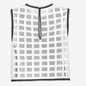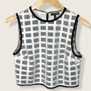 Intermix Colour Block Crop Lace Top in Women's Size Small. Sleeveless. Crew neck. Style # ST5006. This tank is designed in a feminine lace with a solid frayed edge trip. Cropped silhouette. Keyhole detail at the name. Lined at the back. An Intermix exclusive. Very good pre-loved condition. No visible flaws.