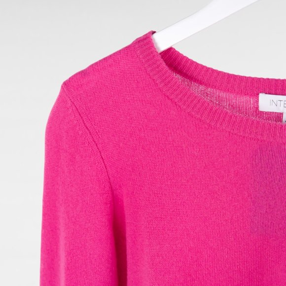 The Valencia sweater from Intermix is made in a pink cashmere, and features long sleeves with ribbed cuffs, thumb holes, a ribbed crew neckline, a ribbed hem, and distressing on the cuffs and hem.