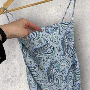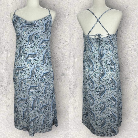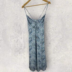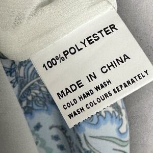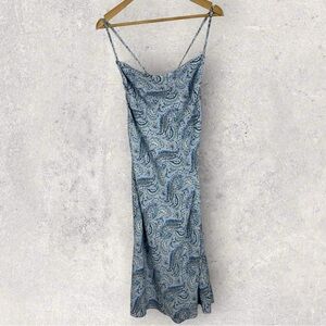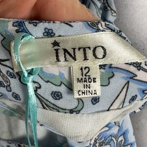Into Blue Floral Midi Dress in Women's Size 12. Ties at the back. Lined. Poly. Made in China. Hand wash. Drape neck. Side zipper closure. Great pre-owned condition. Please review all photos.