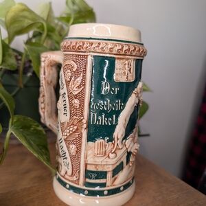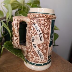 Beautiful ceramic beer stein featuring detailed designs and German script. Perfect for collectors or as a decorative piece.