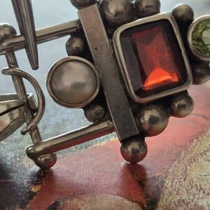 This stunning pendant showcases a captivating red garnet peridot and pearl set in intricate silver metalwork, exuding a vintage charm. The architectural design adds depth and dimension, making it a standout piece for any occasion. Its unique combination of colors and craftsmanship makes it a timeless addition to your jewelry collection.
