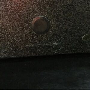 This ornate rectangular box features a stunning silver-toned metal design adorned with intricate raised patterns that create a textured surface. The vintage-inspired ornamentation showcases floral and organic motifs, making it a captivating decor piece for any setting.