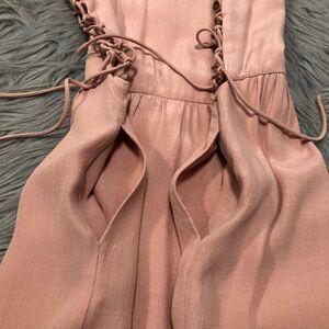 Excellent condition. Fully lined. Lace details on both sides, making the chest area of the dress adjustable. Hidden side zip closure. Inseam pockets. Single button closure at the back.