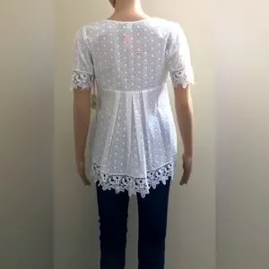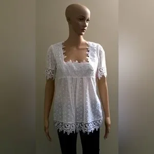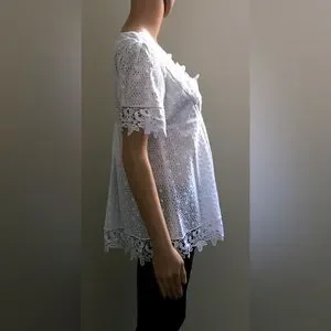 White Short Sleeve Eyelet Lace Tunic Top with Side Zip. Floral Lace Detail at Neck, Cuff and Hem. Square Neckline. This top is see through but has a lined upper for a little more coverage in the bust area