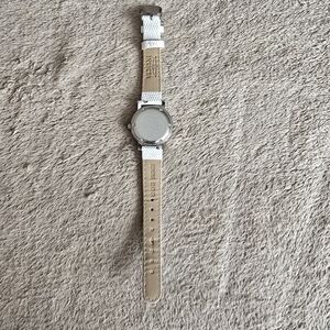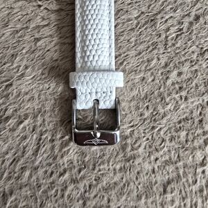 case, crystal accents on the bezel and interchangeable leather straps. The watch has a silver dial with Roman numeral markers and ispowered by a Japanese quartz movement and is water-resistant up to 100 meters. In very good working condition, black strap from original set and box not included.