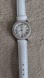 case, crystal accents on the bezel and interchangeable leather straps. The watch has a silver dial with Roman numeral markers and ispowered by a Japanese quartz movement and is water-resistant up to 100 meters. In very good working condition, black strap from original set and box not included.