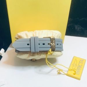 Elegant Invicta watch with a gold bezel. Features a gray strap and silver dial. Perfect for any occasion.