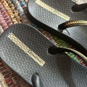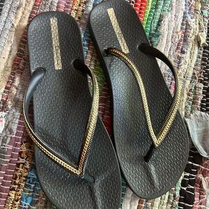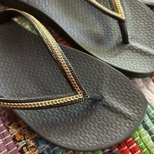 Elegant black sandals with gold accents. Ideal for casual wear. Comfortable and stylish.