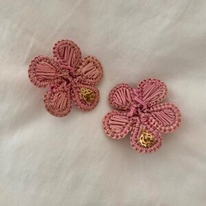 Cute light pink on dark pink flower earrings, handwoven of Iraca Palm. Bought for 48USD (converted to CAD below) from Victoria Dunn and worn a few times. Very light on the ears.