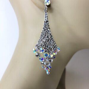 Iridescent Long Crystal Earrings with Aurora Borealis Rhinestone Silver Earrings