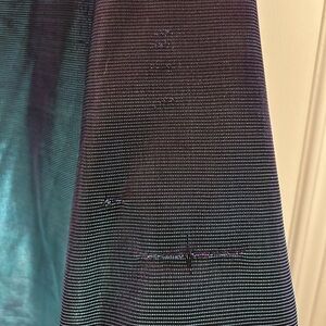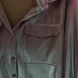 Very pretty, shiny metallic fabric button-down, collared shirt. Shirt has black lining, so is not itchy. Material looks teal in some light and purple in other light. Two front pockets. Some runs on back of one sleeve (see picture). Very cute to throw over a black tshirt, or tuck into a skirt for night out.