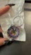 Stylish iridescent wheel keychain with a metallic finish. Perfect for car enthusiasts.