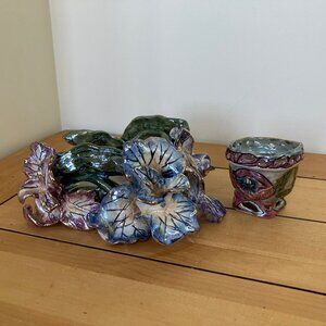 Heather Goldminc for Blue Sky ceramic candle holders have pretty iridescent luster glaze. Larger piece has 3D iris flowers and can be used to hold large candles, place a vase in the center, or style to your preference. Measures approx. 3 1/2" tall x 8" x 7 1/2". Inner dimension is approx. 4" across. Dated 2001 on the bottom.
