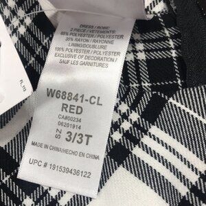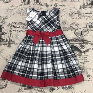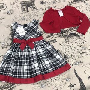 This two-piece plaid dress with grosgrain ribbon trim is paired with a knit cotton blend bolero cardigan.