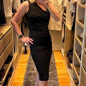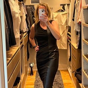 Was bought as a sample so it does not have a fabric tag, I am not sure what the material is but it feels like a blend of acetate and polyamide and it is stretchy, it has a band of leather running along the front