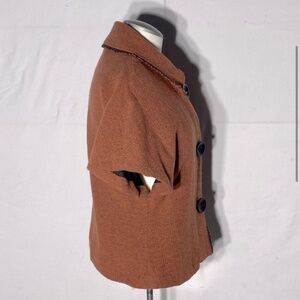 Great used condition. No holes or stains. No pulls. Minimal pilling in high friction areas. Orange wool blend. Lined like a blazer. Button up and short sleeves. Size 8, measurements in pics.