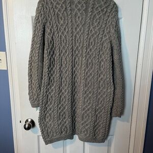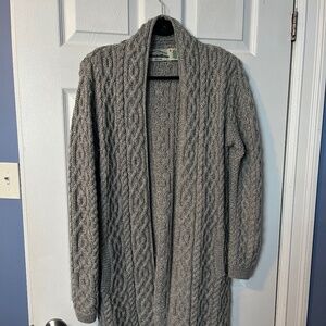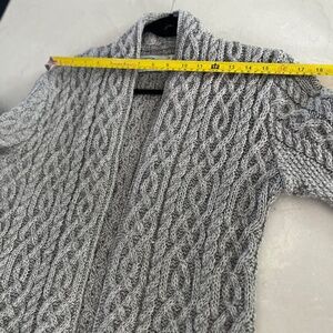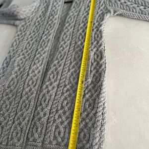 Beautiful medium grey aran cardigan sweater. 100% merino wool. Worn one time. Cable knit with side pockets. Sizes in photos