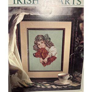 A timeless cross-stitch pattern booklet featuring a detailed Irish-inspired design. Includes a charming woman with a dog motif and a color guide.