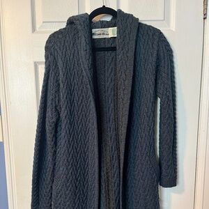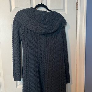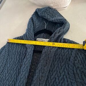 Beautiful Irish knit cardigan sweater with hood. Cable know with side pockets and small side slits. Worn once. Like new. Measurements in the photos. Color is mallard blue. This fits like a medium.