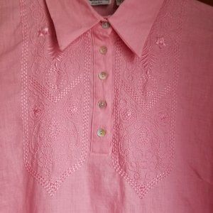 Colour pale, coral pink with matching thread embroidery, mother of pearl buttons. Material 100% Irish linen. Season spring, summer, office wear, condition little used, hardly worn, well cared for, slight rubbing marks on back of shirt where it has been rubbed/caught, see photo. Washing info. hand wash, luke warm water.