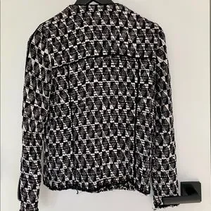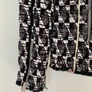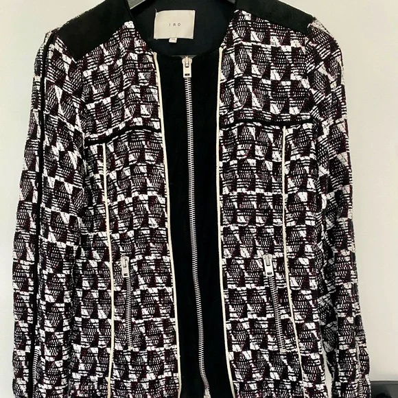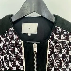 Iro jacket in size 38. Black and white with some red detail throughout. Leather detail. Frayed at bottom of jacket and sleeves (by design). Zipper details on sleeves and 2 pockets at front. It’s a light jacket - not warm or lined.