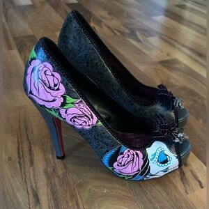 Bold black heels with vibrant purple floral design. Features intricate detailing and a striking look. Perfect for adding flair to any outfit. Cute pink stitching and charms on the toe.