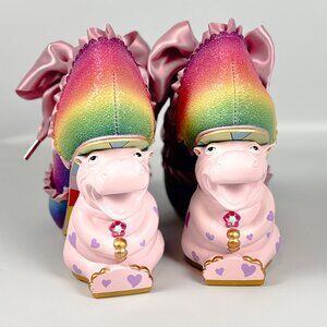 Details: One of Irregular Choice’s most playful statement heels! Features a pastel pink hippo character heel decorated with purple hearts, paired with rainbow glitter uppers and oversized satin ribbon laces. A true collector’s piece from Irregular Choice’s whimsical character heel line. Perfect for fans of magical fashion and conversation-starting shoes.