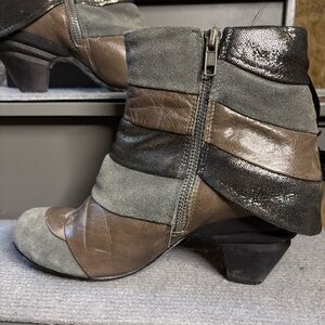 These bootie’s are a ‘hoot’. Layered matte suede and metallic leather, and adorned with brass look owl pendant and peacock feathers. Truly show stoppers. Predominantly gray, taupe and a hint of dark gray. The perfect addition to your NYE ‘fit.