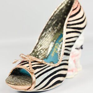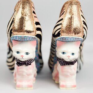 Details: Paw Print is one of Irregular Choice’s most adorable character heel designs, featuring a porcelain-style white cat heel with a polka dot ribbon bow. The uppers are crafted in bold zebra print with metallic rose gold accents and floral outsole detail. A highly collectible and whimsical design that perfectly captures IC’s playful spirit — especially sought after by cat lovers and collectors.