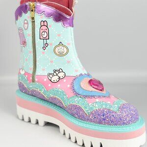 Details: From the Irregular Choice x Sanrio Hello Kitty collection, these Just Be You statement boots are bursting with playful details: striped pastel uppers, glitter scallop trims, a chunky white platform sole, and a framed Hello Kitty portrait surrounded by heart gems and pearls. With whimsical accents like mini faux pockets and metallic panels, this rare collab pair is a true show-stopper. Extremely hard to find, especially unworn.