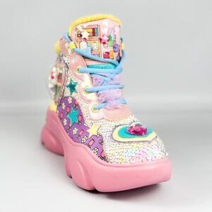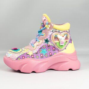 Details: From the Irregular Choice x Sanrio Hello Kitty collection, these You Brighten My Day chunky sneakers feature pastel uppers with floral and star motifs, sequins, and rainbow accents. A standout detail is the 3D Hello Kitty figurine set inside a heart-shaped window on each side of the shoe. Finished with thick pink platform soles and colorful laces, this rare pair blends comfort with the whimsical artistry Irregular Choice is known for.