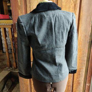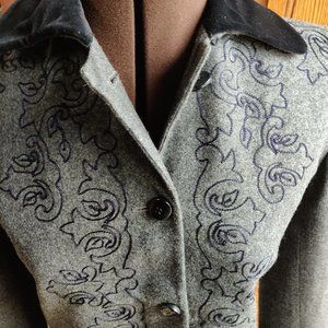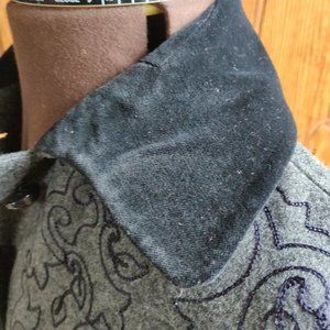 Grey with black embroidery, velvet collar and cuffs. Lined with silk like material.