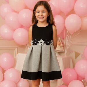 This charming girls fit and flare dress features a stylish black and gray design, perfect for any occasion. Hidden back zipper. ĺllThe floral accents add a touch of elegance.