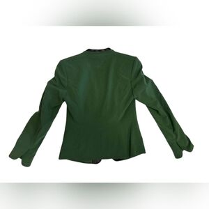 Green blazer clasp closure shoulder pads false front pockets lined long sleeve open slit sleeve minimal stretch available