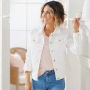 Features: cropped length, foldover collar, long sleeves, full logo button front, two front chest pockets with button flaps, button-close cuffs, seaming details, two waist seam pockets, four buttons on adjustable band at waist back, back length is slightly shorter than front
