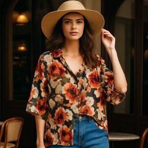 IMNYC Elegant sheer relaxed fit blouse with a vibrant floral pattern. Perfect for layering. Hidden button up front.