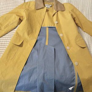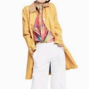 Like new Isaac Mizrahi x Target 20th Anniversary Collection barn jacket in size medium. Bold, beautiful yellow with light blue colour inside and made from 100% cotton (base), polyester lining, and a corduroy collar. The cotton fabric helps hold the shape of this trench. This knee-length midi-jacket features flap pockets, big white buttons with a cover flap, adding a sophisticated detail and a back slit that can remain open or closed (with a button).