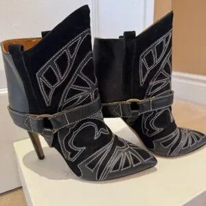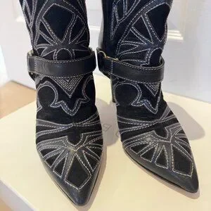 Black Isabel Marant suede western ankle boots with lleather trim, pointed toes, stirrup detail at ankles and stacked heels.