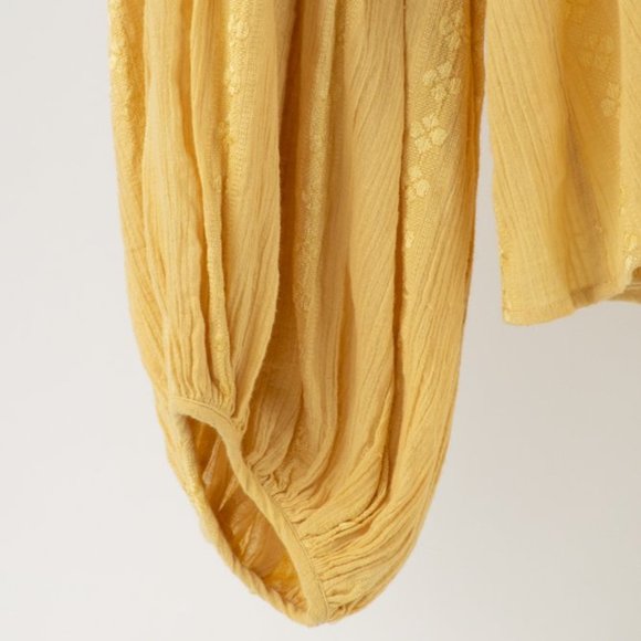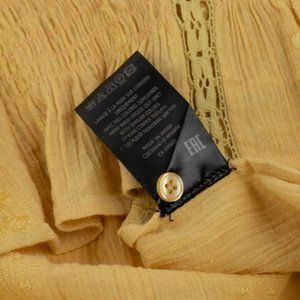 A voluminous pale goldenrod yellow cotton peasant blouse that epitomizes Isabel Marant’s Parisian boho chic, featuring a high neckline with a lace collar, entredeux lace detailing at the shoulders and down the front, shirring at the waist, and long, billowy sleeves.