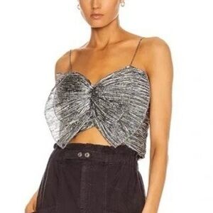 A show stopping crop from Isabel Marant - the Tresha with metallic bow embellishment. Full zip closure at the back. Removable spaghetti straps. Metallic crinkle construction. Size EU 38. 17” pit to pit. Lined.