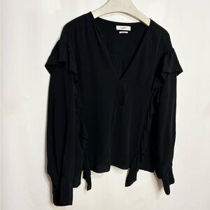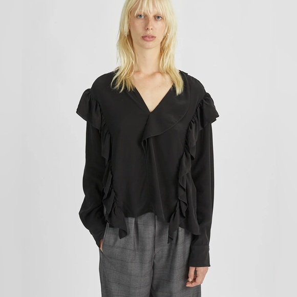 Black V-neck blouse with a ruffled hem alongisde the left collar and ruffled detailing down the sides. Relaxed fit. Buttoned cuffs. Seamed back yoke. Inverted back pleat.