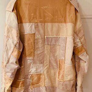 This has been worn twice. It is exactly as designed: distressed, frayed, patched, and perfect. An all cotton one of a kind stunner in incredible pinks, creams, and tans. Fully lined. Asymmetrical zipper. Ptp 22, length 29. A gem