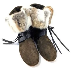 Black leather back & lacing. Olive green suede front. Rabbit fur trim.