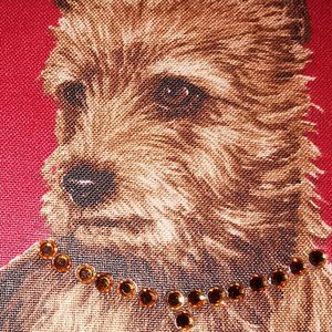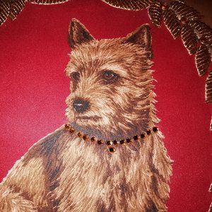 This ( unlike my other IFs) is soft supple leather. The bag with the flap opened is brown with red sides and a red and brown wide adjustable strap. The dog featured on the front of the bag is adorable. It's an oval picture frame sequinned and beaded, and his collar is jewelled. He ( the dog ) is lovely.